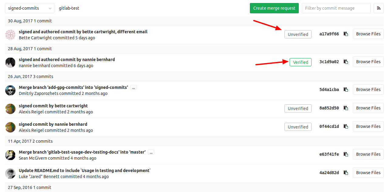 You can review commits for a merge request, or for an entire project, to confirm they are signed.